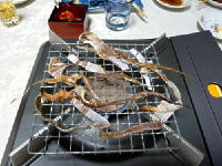 五月ゴールデンウィークに 自宅で賑やかにバーベキューです 近くに住む息子家族や 息子の嫁の両親を招いて 車庫に道具を持ち出して 小型冷蔵庫も外にセット 肉や野菜など網にのせて 鮎(あゆ)は 串に刺して縦にして炭火でじっくり焼く ニンニクは 輪切りにしてオイルにいれる 大勢集まると何もかもがおいしい お酒やワインもずいぶん空きました |